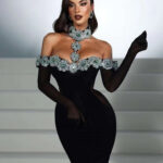 Gants tendance, luxueux orné de diamants, robe moulante taille basse, robe de soirée de luxe pour tapis rouge.