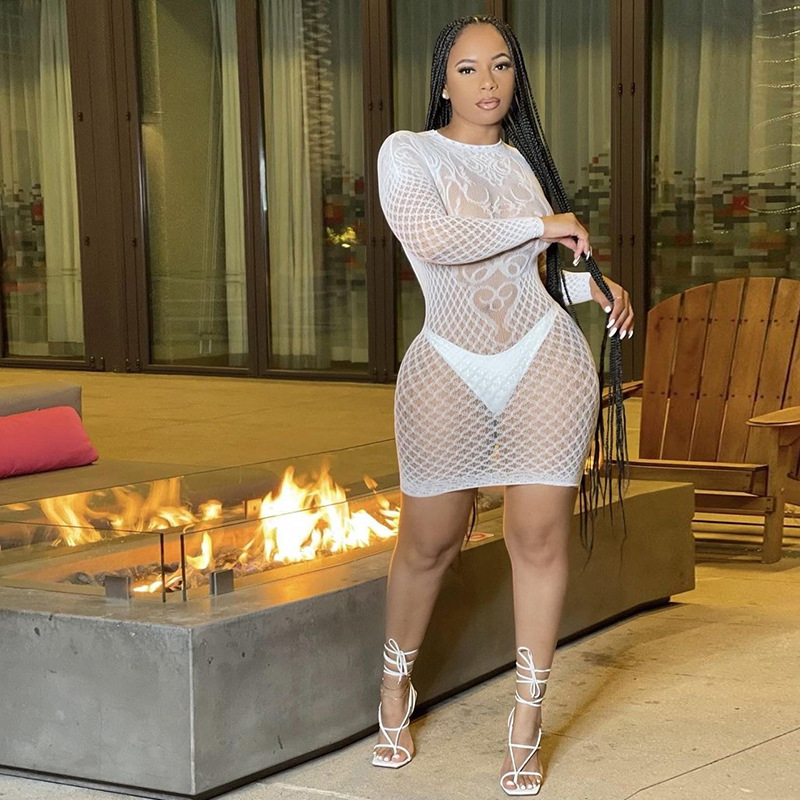 Robe courte moulante en jacquard ajouré à col rond et taille haute, collection automne femme.