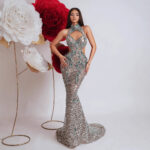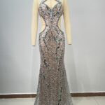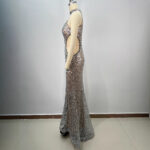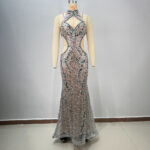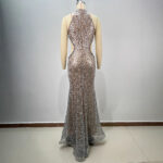 Robe de soirée moulante à col rond et dos nu ornée de diamants colorés