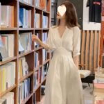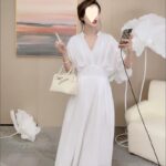 Soyez le premier à laisser votre avis sur “Robe midi blanche à col en V pour femme, au design unique et élégant, coupe amincissante.”