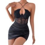 Robe moulante à bretelles croisées, plissée, moulante, à anneaux en acier et coupe ajustée.